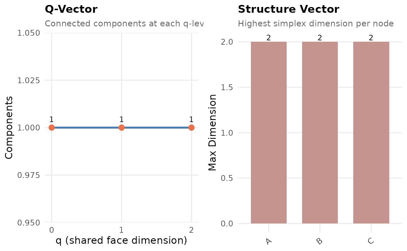Two panels: Q-vector (components at each connectivity level) and structure vector (max simplex dimension per node).