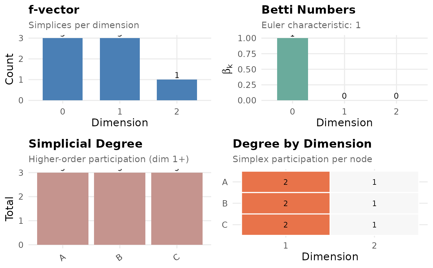Produces a multi-panel summary: f-vector, simplicial degree ranking, and degree-by-dimension heatmap.